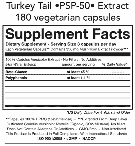Potent PSP Turkey Tail organic extract containing at least 45% beta-glucans.